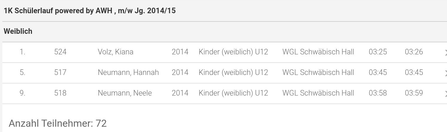 Die WGL war mit fünf Athleten am Start. Besonders die Jugend überzeugte: Kiana Volz (U12) lief im 2,1 km Mini-Halbmarathon in 8:29 Minuten auf einen starken 2. Platz unter 64 Mädchen. Jakob Stecher (U16) gewann den 4,2 km Mini-Marathon souverän in 16:00 Minuten. Auch Tessa Neuhäuser (U10) zeigte ihr Talent und bewältigte den 1 km Mini-10er im Alter von nur sieben Jahren in 5:49 Minuten.