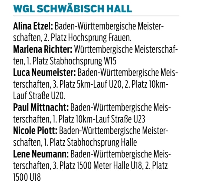 Die Baden-Württembergischen Hallenmeisterschaften der Altersklassen U18 und älter wurden am Wochenende in der modernisierten Europahalle in Karlsruhe ausgetragen. Die WGL/PostSG Schwäbisch Hall ging mit einem kleinen, aber äußerst erfolgreichen Team von drei Athleten an den Start.